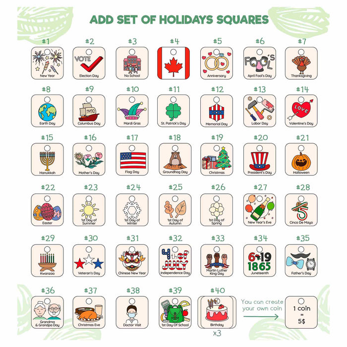 You can add other events by ordering coins with a custom print (US$ 5 each) or draw your own symbols on the blank coins that we can include free of charge upon your request.