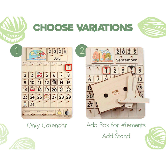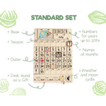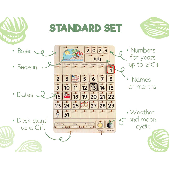 The standard set of calendars includes board, dates, numbers for years up to 2054, seasons, names of months, weather, and moon cycle.