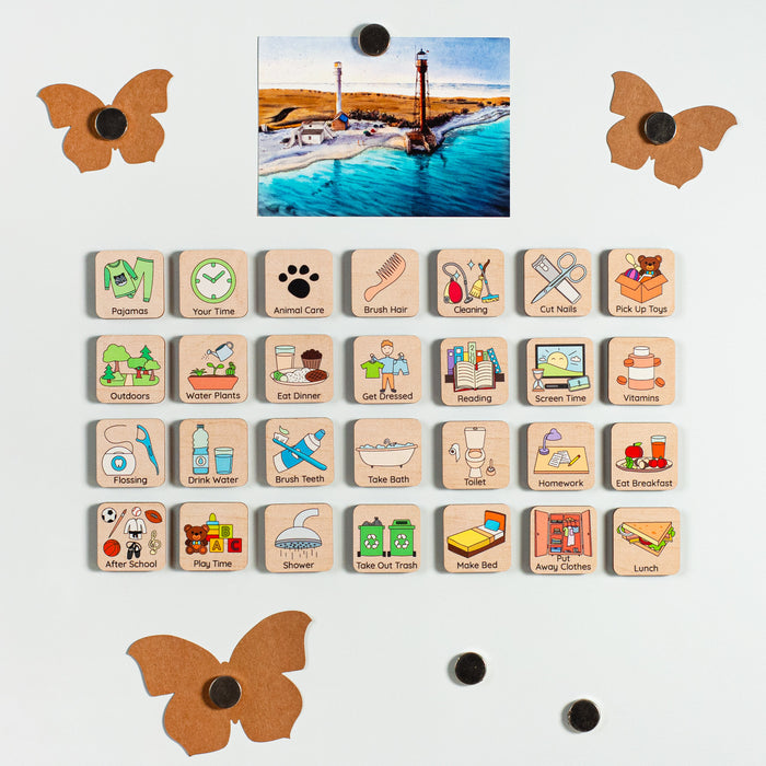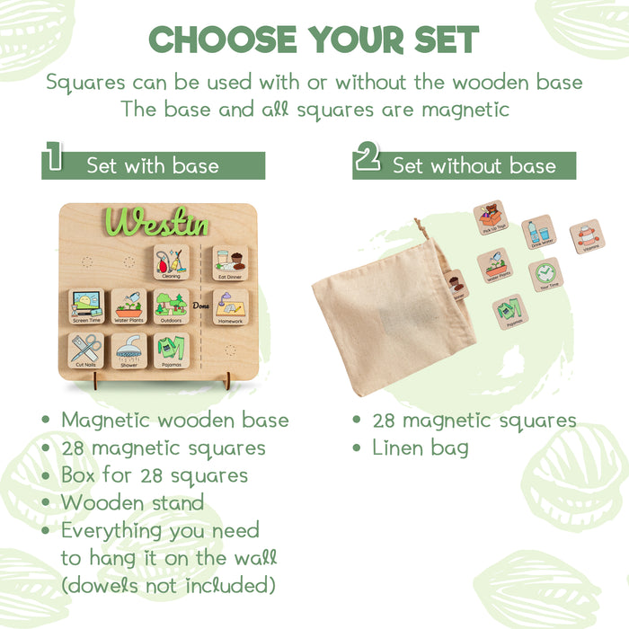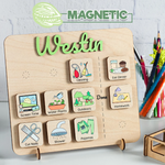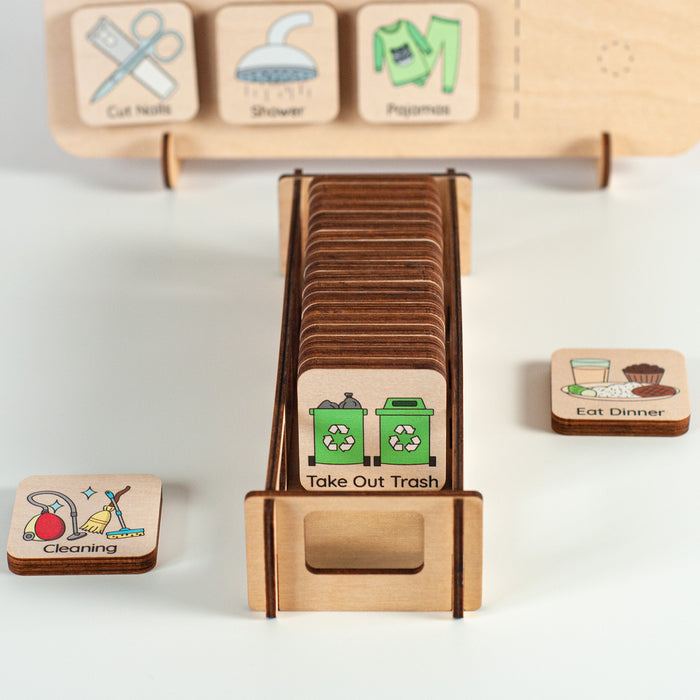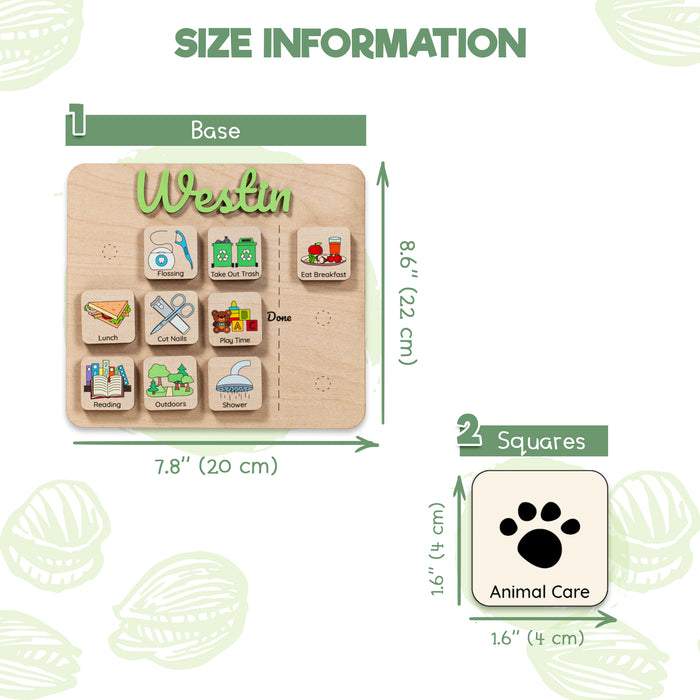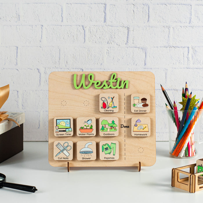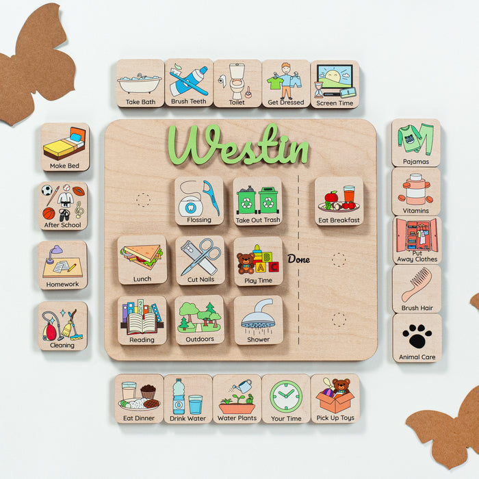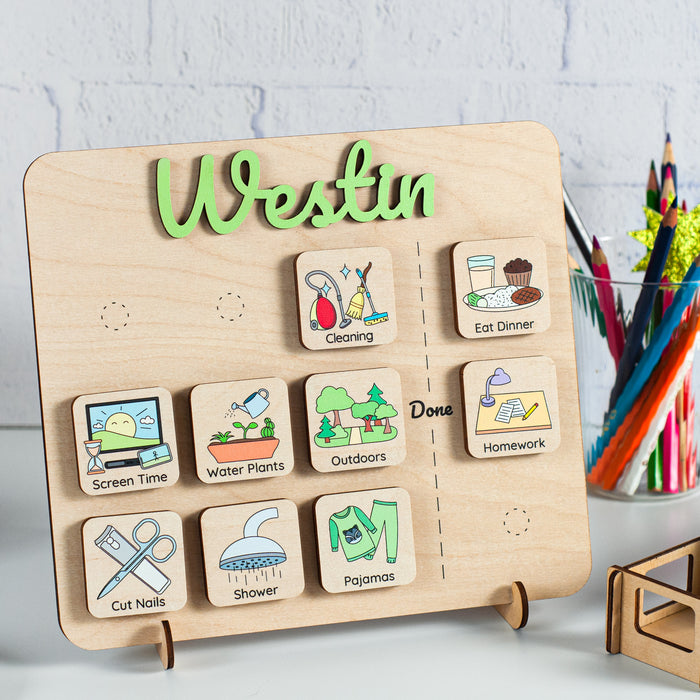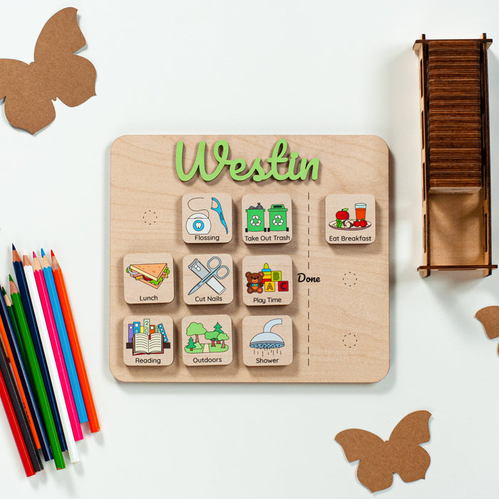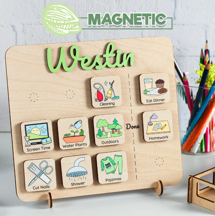 Introducing the Personalized Routine Chart, a wooden visual schedule designed to make daily routines fun and manageable for kids. Crafted with care and personalized with your child's name, this unique chart brings organization and excitement to their day-to-day activities.