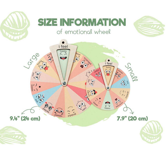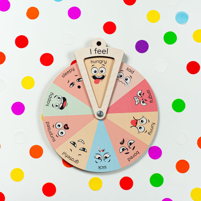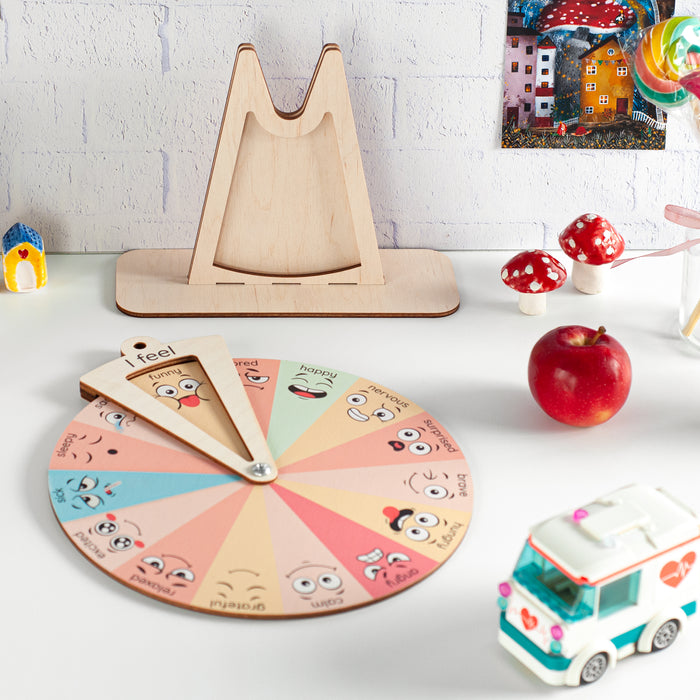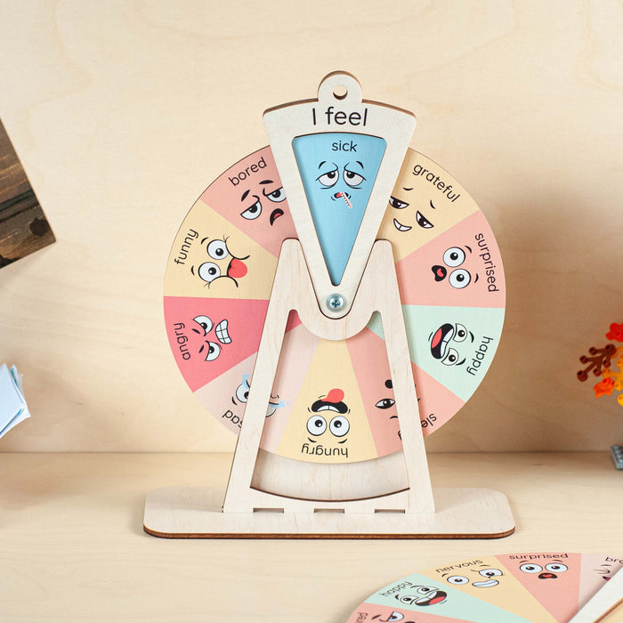 Immerse your child in a world of emotions with this engaging and educational Emotion Wheel designed specifically for them. Crafted with care from natural birch plywood, this captivating handmade wheel unlocks a delightful learning experience. Each section of the wheel features vibrant faces expressing unique emotions.