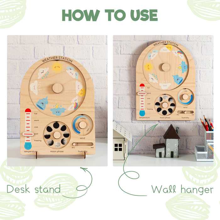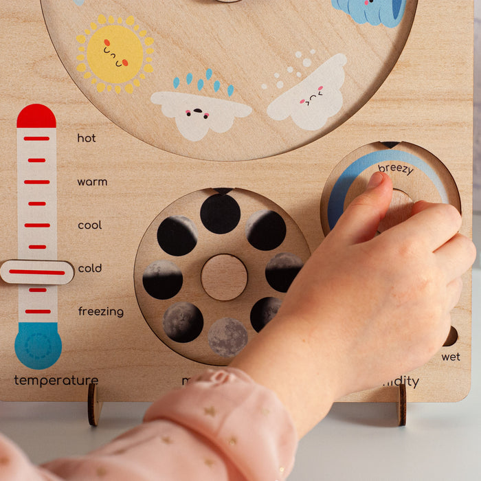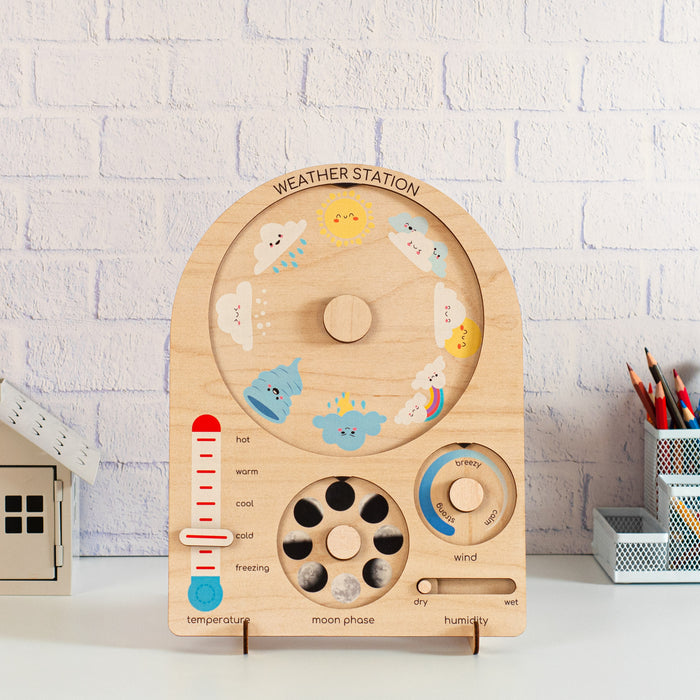 Explore the wonders of our fun-filled weather station, complete with a variety of original features. Move the weather meter, adjust the dials, and slide the thermometer for an interactive educational experience! With 5 movable parts, young meteorologists can actively observe and predict the weather.