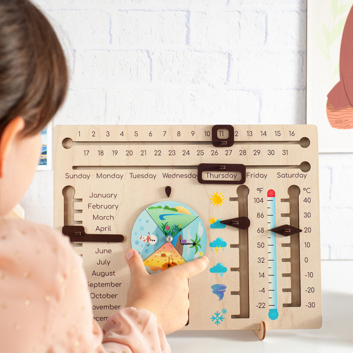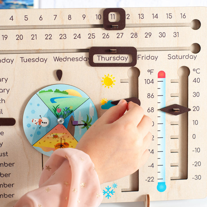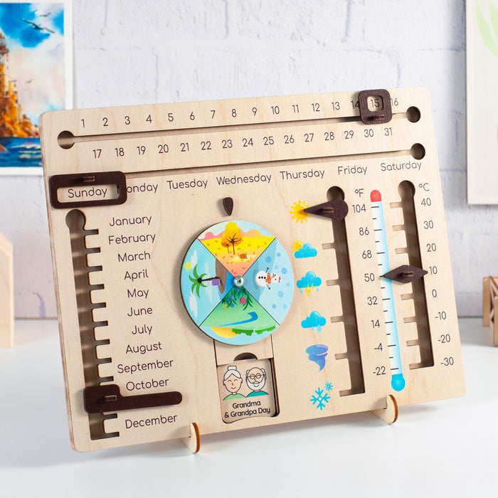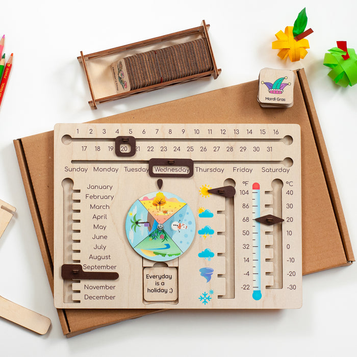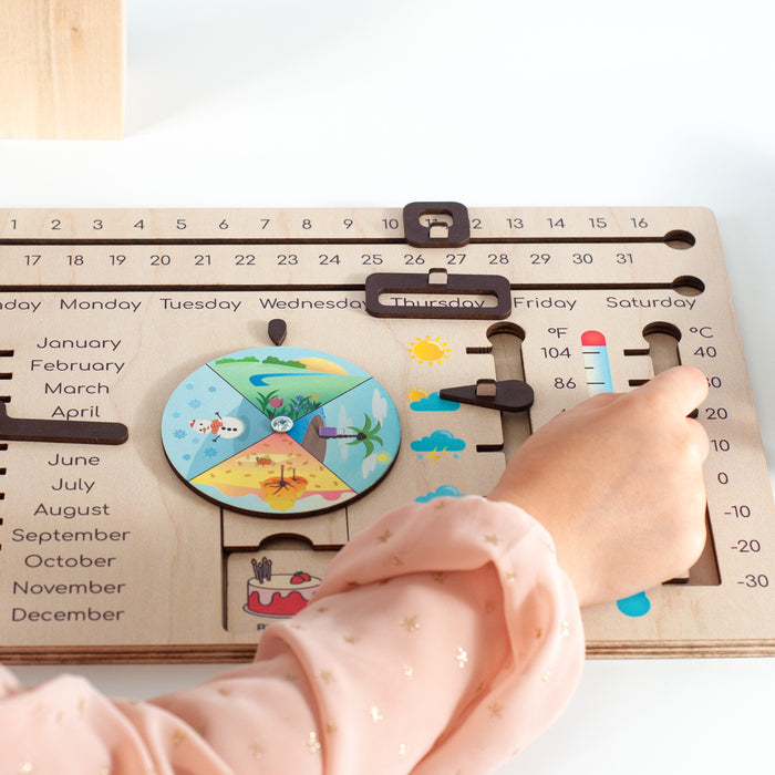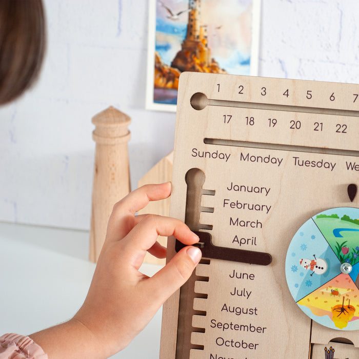 The handcrafted Montessori calendar tailored for kids combines beauty with functionality, helping children grasp the concept of time. This wooden calendar not only serves as an appealing decor piece but also plays a crucial role in your child's learning journey, facilitating the comprehension of dates, numbers, days of the week, months, and seasons. It provides an excellent opportunity to acquaint your little one with time-related concepts, instruct them in calendar usage, mark special occasions like birthdays and cherished holidays, and teach them how to manage a schedule. Creative engagement makes mastering intricate subjects easier, making this classroom calendar an exceptional educational tool.