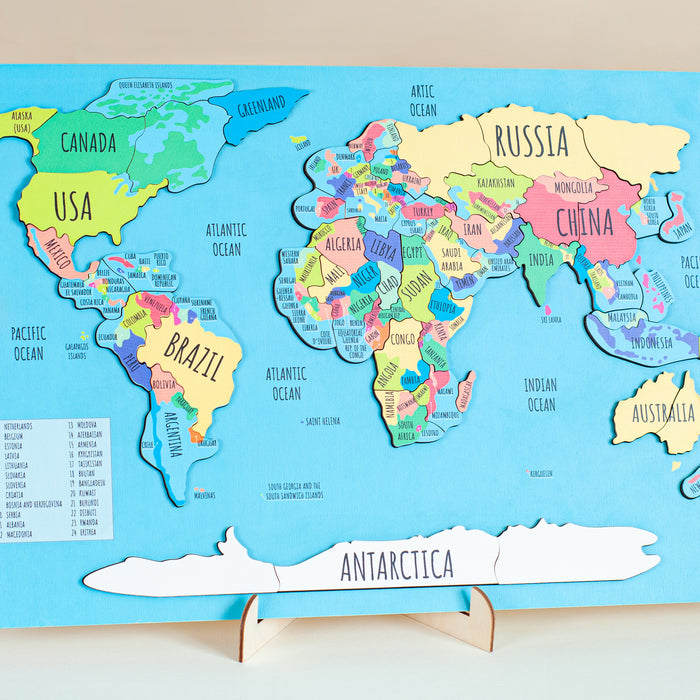 This map is made so that the fun pastime of the child is also very useful. How exactly? The game will develop logic and motor skills during the selection of wooden forms, memory, and associations when memorizing the names of countries, a huge development of geographical knowledge.